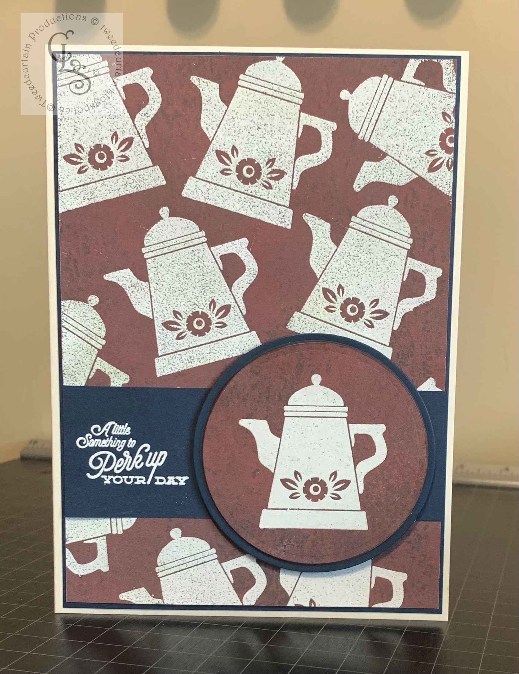 The third World Cardmaking Day Challenge from Scrapbook & Cards Today was to use one stamp for the background and the focal image of a card. I chose this coffee pot from Waltzingmouse Stamps as I needed a masculine birthday card for a coffee lover.